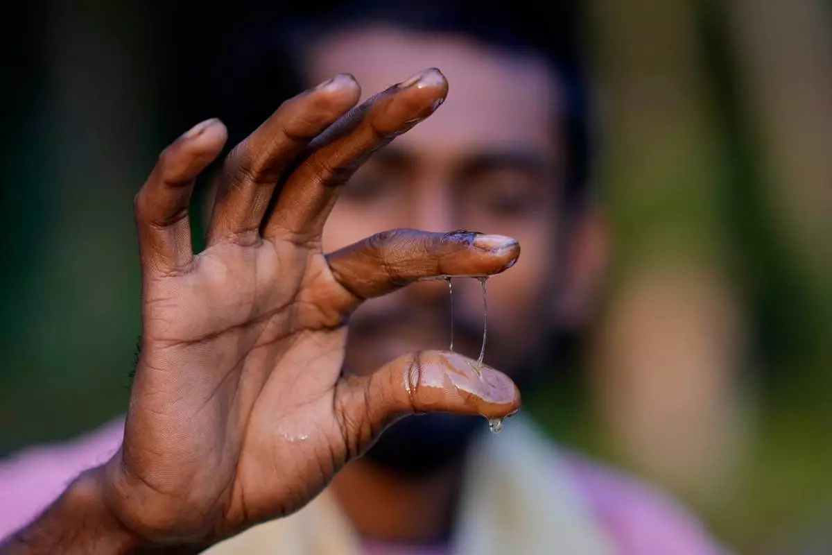 A migratory beekeeper checks the quality of honey at a bee colony near a mustard field in the Binnabari village in Baksa district of Assam, India, Saturday, Jan. 17, 2026. (AP Photo/Anupam Nath)