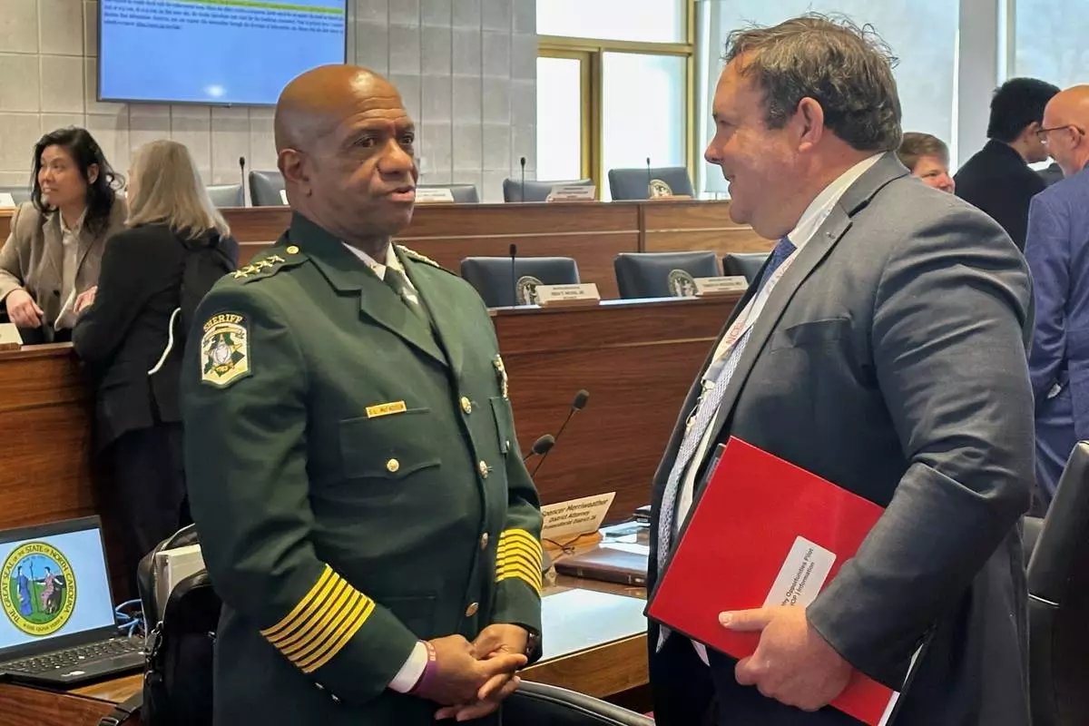 Mecklenburg County Sheriff Garry McFadden, left, speaks with state Rep. Eric Ager, D-Buncombe, during a break in the North Carolina House Select Committee on Oversight and Reform meeting at the Legislative Building in Raleigh, N.C., Monday, Feb. 9, 2026 (AP Photo/Gary D. Robertson)