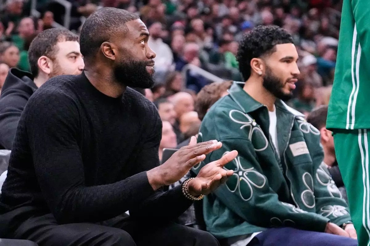 Boston Celtics guard Jaylen Brown, left, applauds while seated alongside forward Jayson Tatum, who both did not play, during the first half of an NBA basketball game against the Sacramento Kings, Friday, Jan. 30, 2026, in Boston. (AP Photo/Charles Krupa)