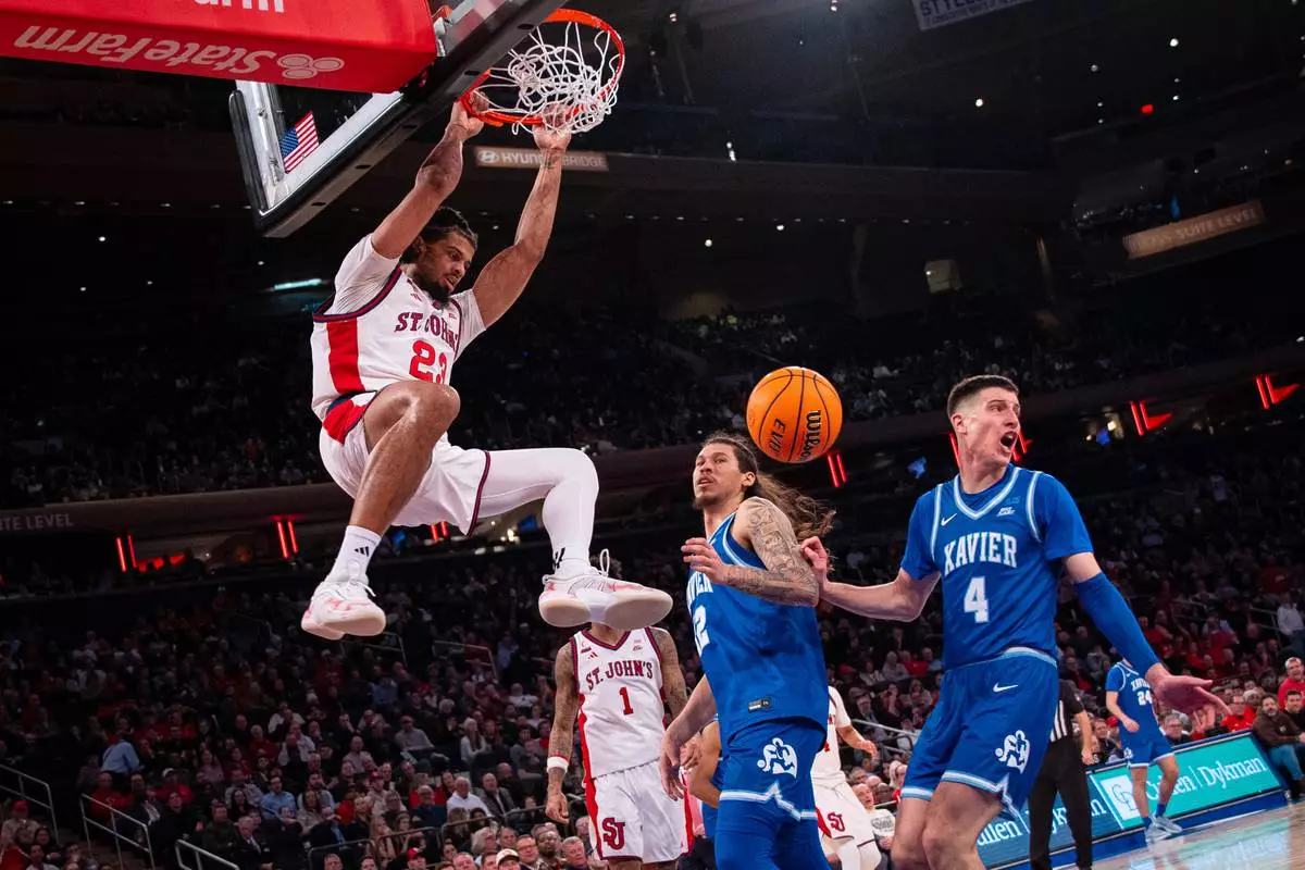 St. John's forward Bryce Hopkins (23) dunks as Xavier's forward Filip Borovicanin (4) reacts during the second half of an NCAA college basketball game, Monday, Feb. 9, 2026, in New York. (AP Photo/Angelina Katsanis)