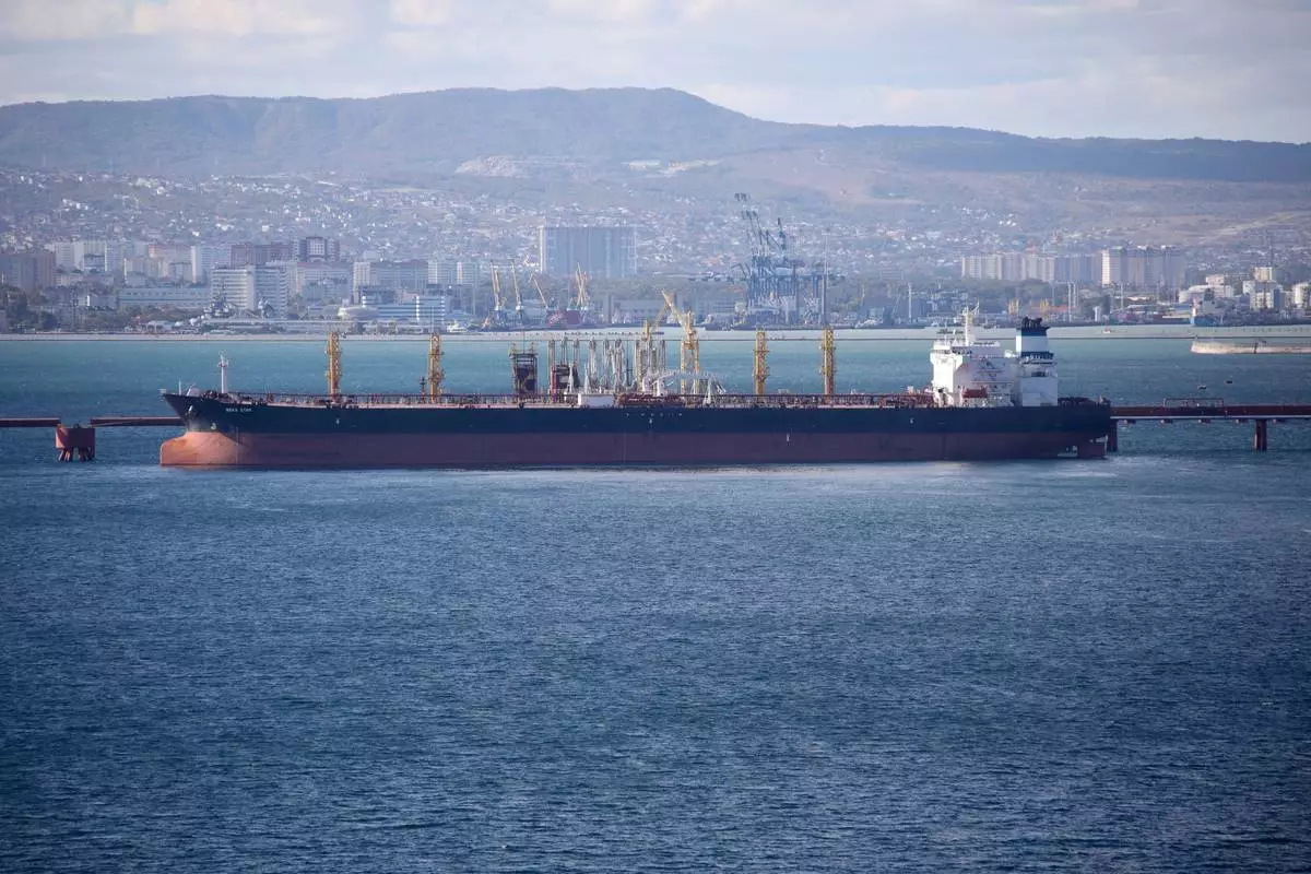FILE - An oil tanker is moored at the Sheskharis complex, part of Chernomortransneft JSC, a subsidiary of Transneft PJSC, in Novorossiysk, Russia, on Oct. 11, 2022. (AP Photo, File)