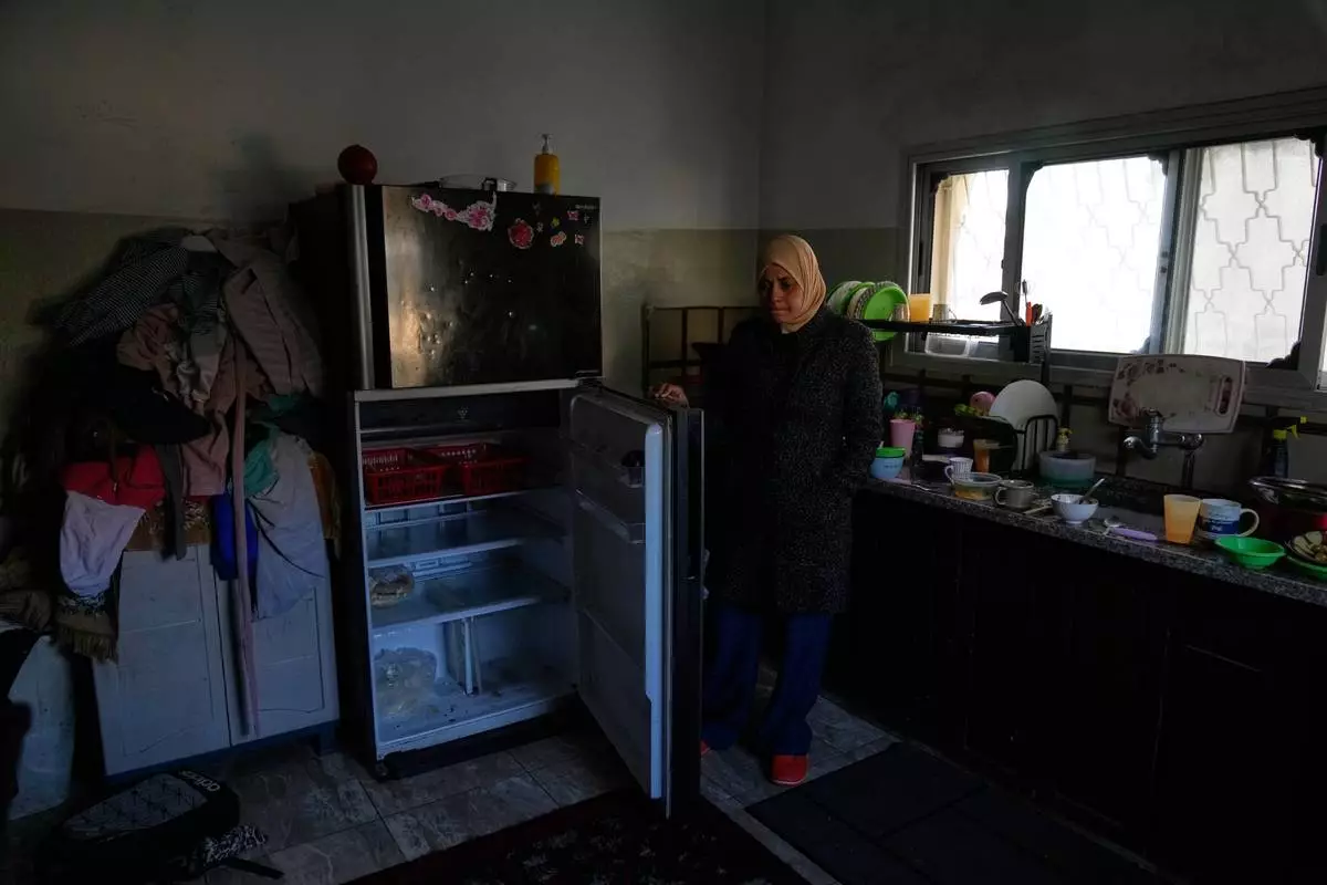 Palestinian laborer Shuhrat Barghouthi shows her empty fridge, saying that she struggles to buy food after Israel revoked work permits for Palestinians in the West Bank city of Tulkarem Sunday, Jan. 18, 2026. (AP Photo/Nasser Nasser)