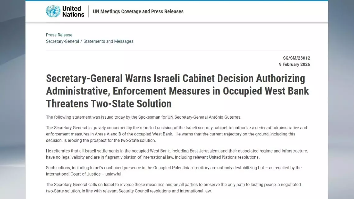 In a statement, Guterres' spokesperson Stephane Dujarric said the UN chief is gravely concerned by the reported decision of the Israeli security cabinet to authorize a series of administrative and enforcement measures in Areas A and B of the occupied West Bank.