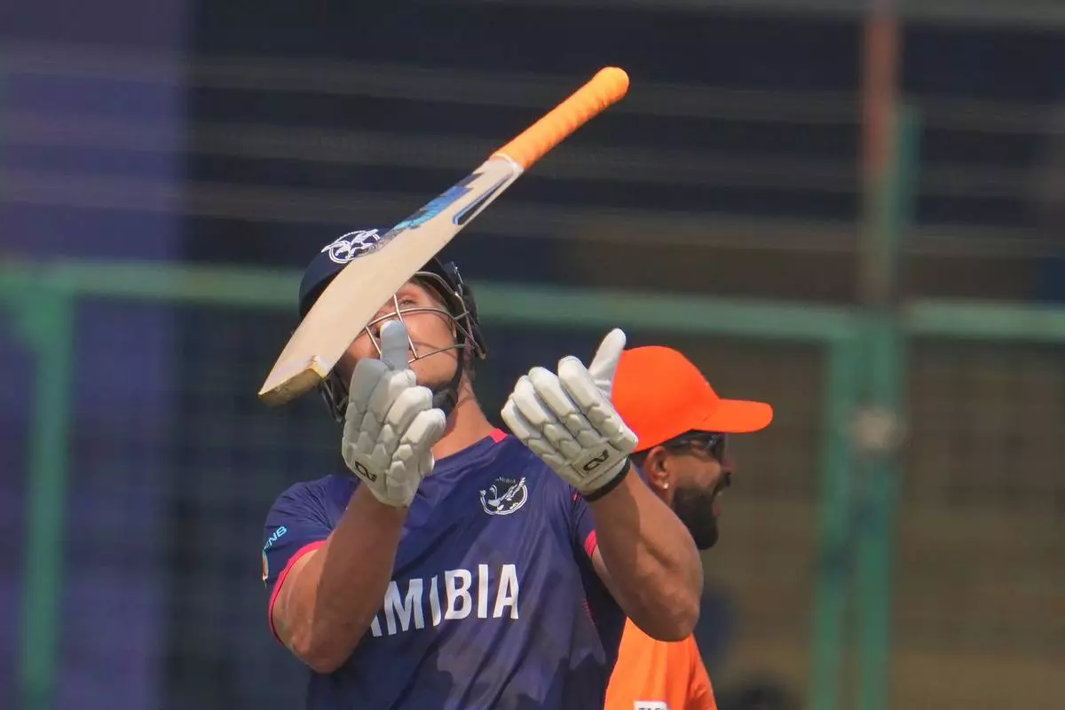 Namibia's Ruben Trumpelmann throws his bat up in the air after losing his wicket during the T20 World Cup cricket match between Namibia and Netherlands in New Delhi, India, Tuesday, Oct. 10, 2026.(AP Photo/Manish Swarup)