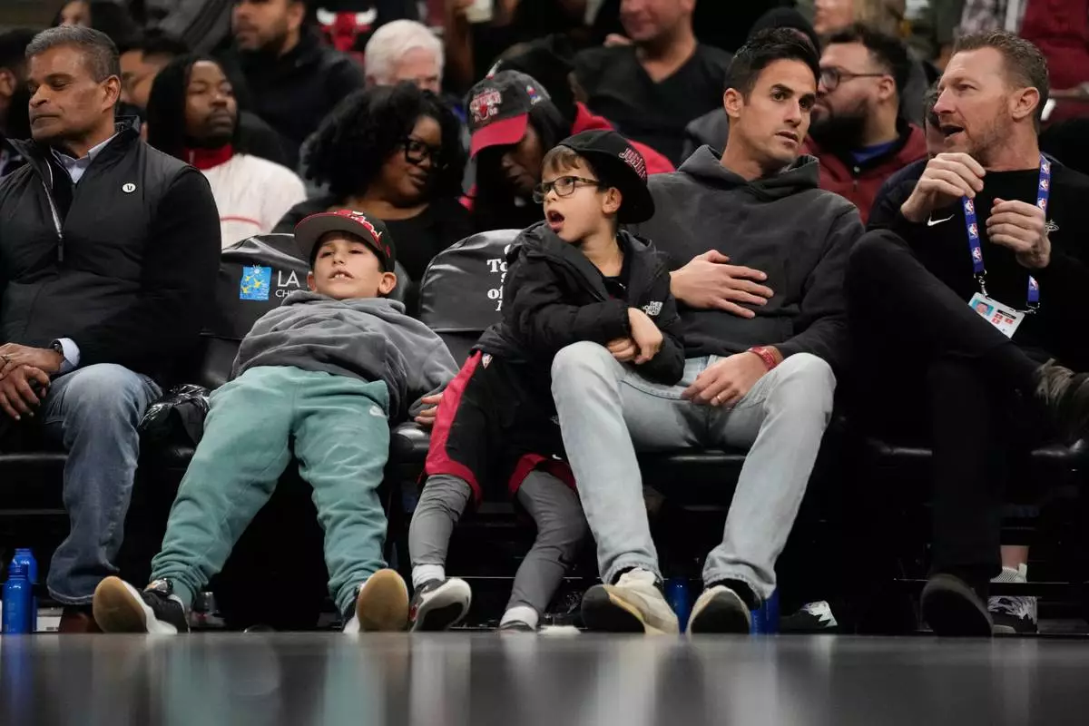 Lucas Gonzalez, 16, center, reacts to a play as he sits courtside with Matias Gonzalez, 13, second from right, and Sergio Masvidal, 15, right, during the first half of an NBA basketball game, Sunday, Feb. 1, 2026, in Miami. (AP Photo/Lynne Sladky)