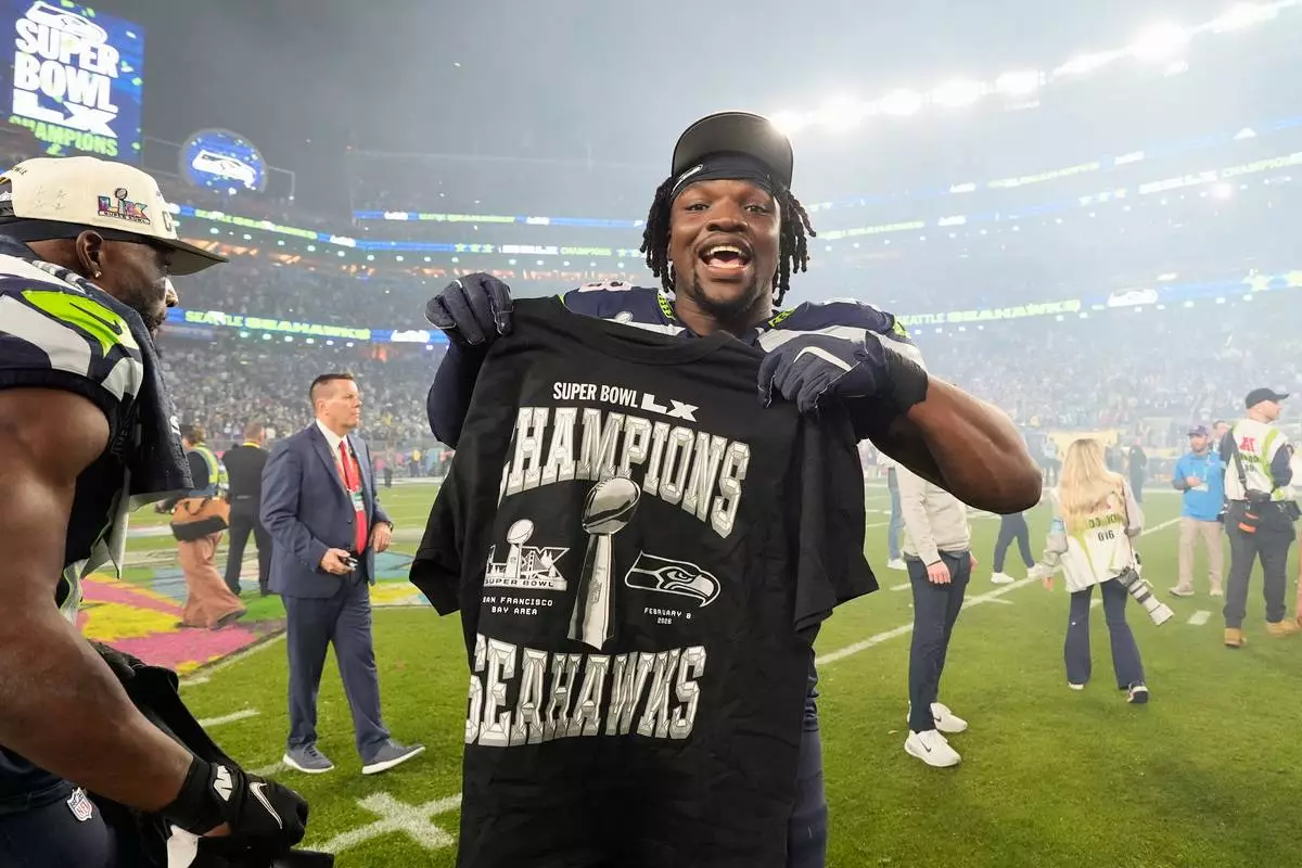 Seattle Seahawks linebacker Boye Mafe celebrates after the NFL Super Bowl 60 football game against the New England Patriots, Sunday, Feb. 8, 2026, in Santa Clara, Calif. (AP Photo/Steve Luciano)