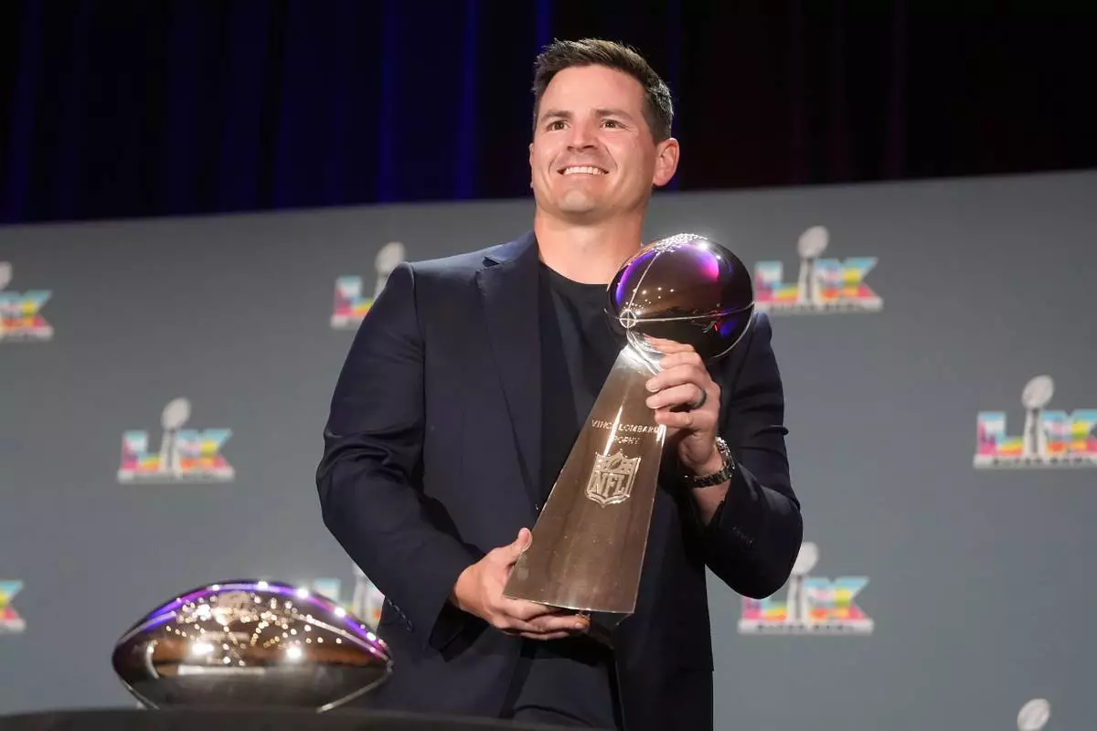 Seattle Seahawks head coach Mike MacDonald holds the Lombardi Trophy while posing during a news conference the morning after Super Bowl 60 between the Seahawks and the New England Patriots in San Francisco, Monday, Feb. 9, 2026. (AP Photo/Jeff Chiu)