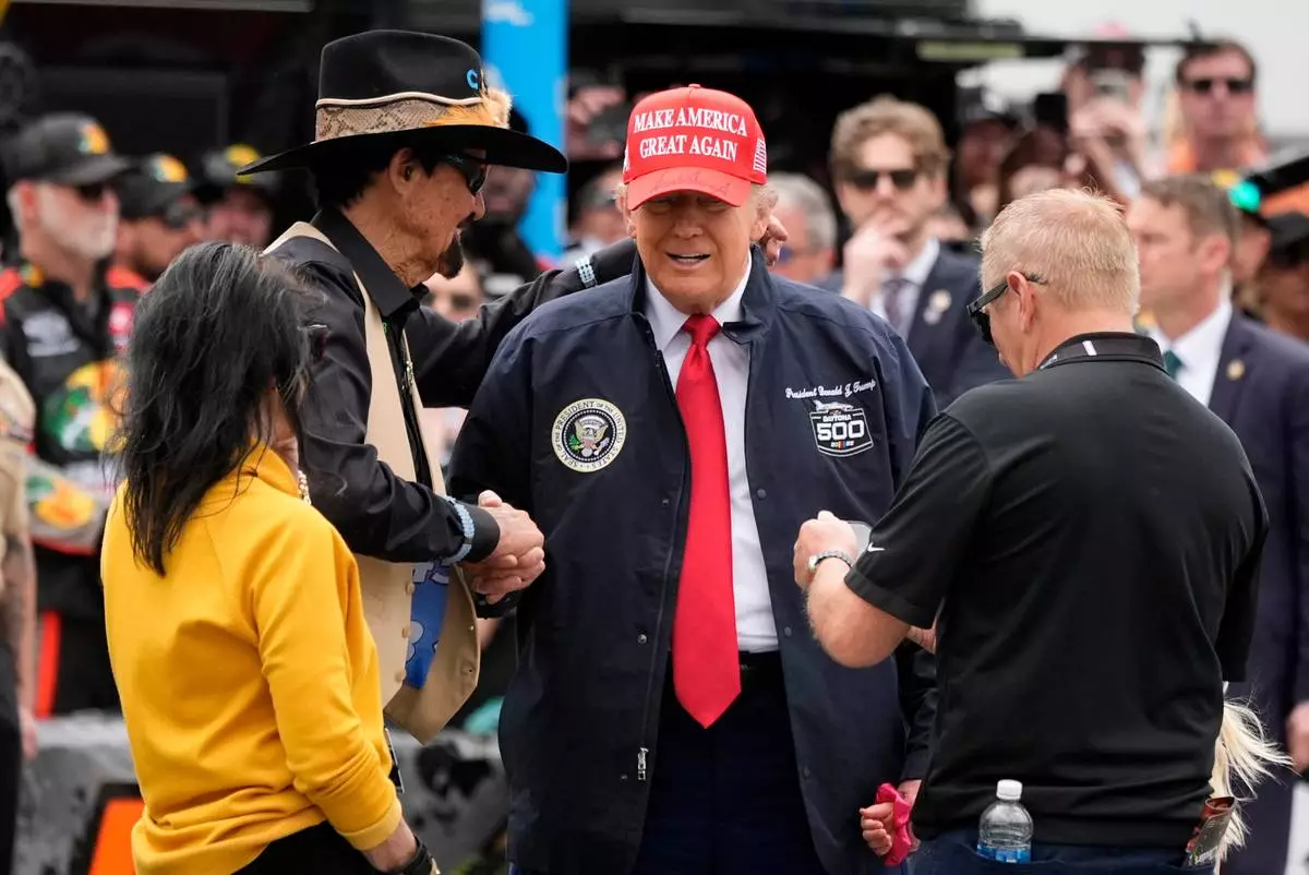 FILE - President Donald Trump, second right, shakes hands with NASCAR Hall of Fame driver Richard Petty at the NASCAR Daytona 500 auto race at Daytona International Speedway, Feb. 16, 2025, in Daytona Beach, Fla. (AP Photo/John Raoux, File)