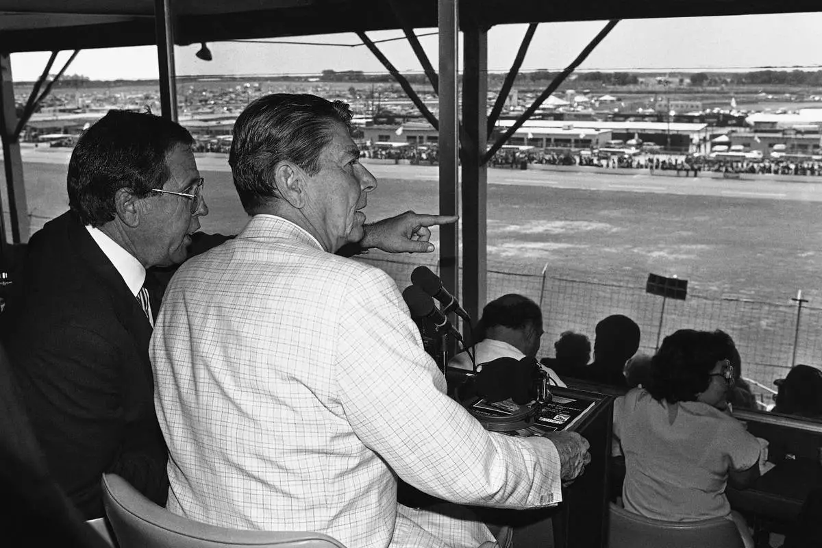FILE - President Ronald Reagan, front right, sits with William France Jr., president of NASCAR and part owner of the Daytona Speedway, and watches the running of the Firecracker 400 stock car race July 4, 1984, in Daytona Beach, Fla. (AP Photo/Ira Schwarz, File)