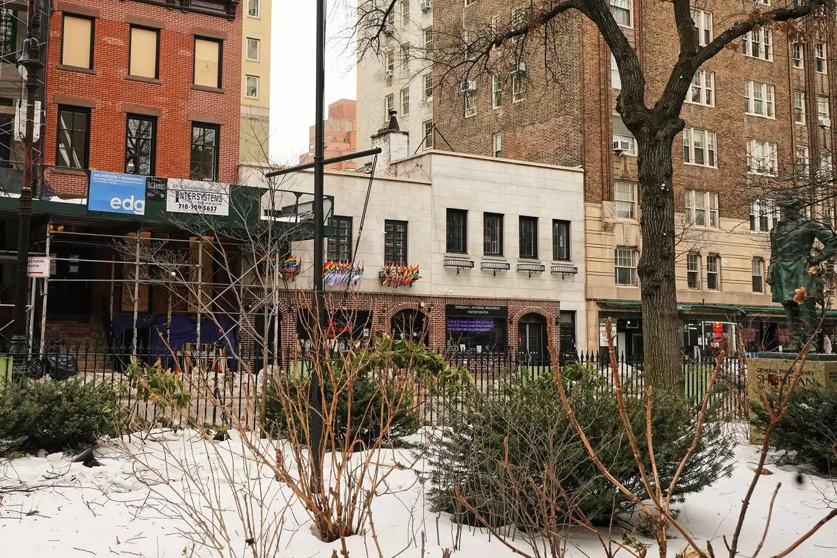 The Trump administration has stopped flying a rainbow flag on the pole, center, in the Stonewall National Monument, adjacent to the Stonewall Inn, background center, in New York, Tuesday, Feb. 10, 2026. (AP Photo/Richard Drew)