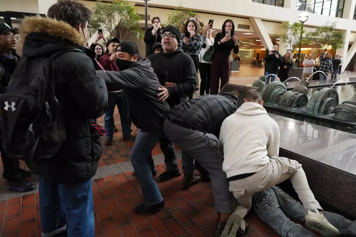 Plain clothed federal agents tackle and arrest a man after a short foot chase in the lobby of the Hennepin County Government Center in Minneapolis, on Tuesday, Feb. 10, 2026. (Anthony Souffle/Star Tribune via AP)