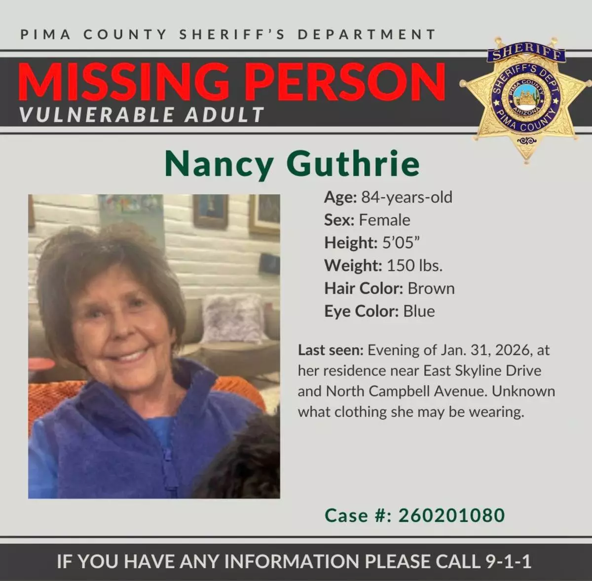 FILE - This image provided by the Pima County Sheriff's Department on Feb. 2, 2026, shows a missing person alert for Nancy Guthrie. (Pima County Sheriff's Department via AP, File)