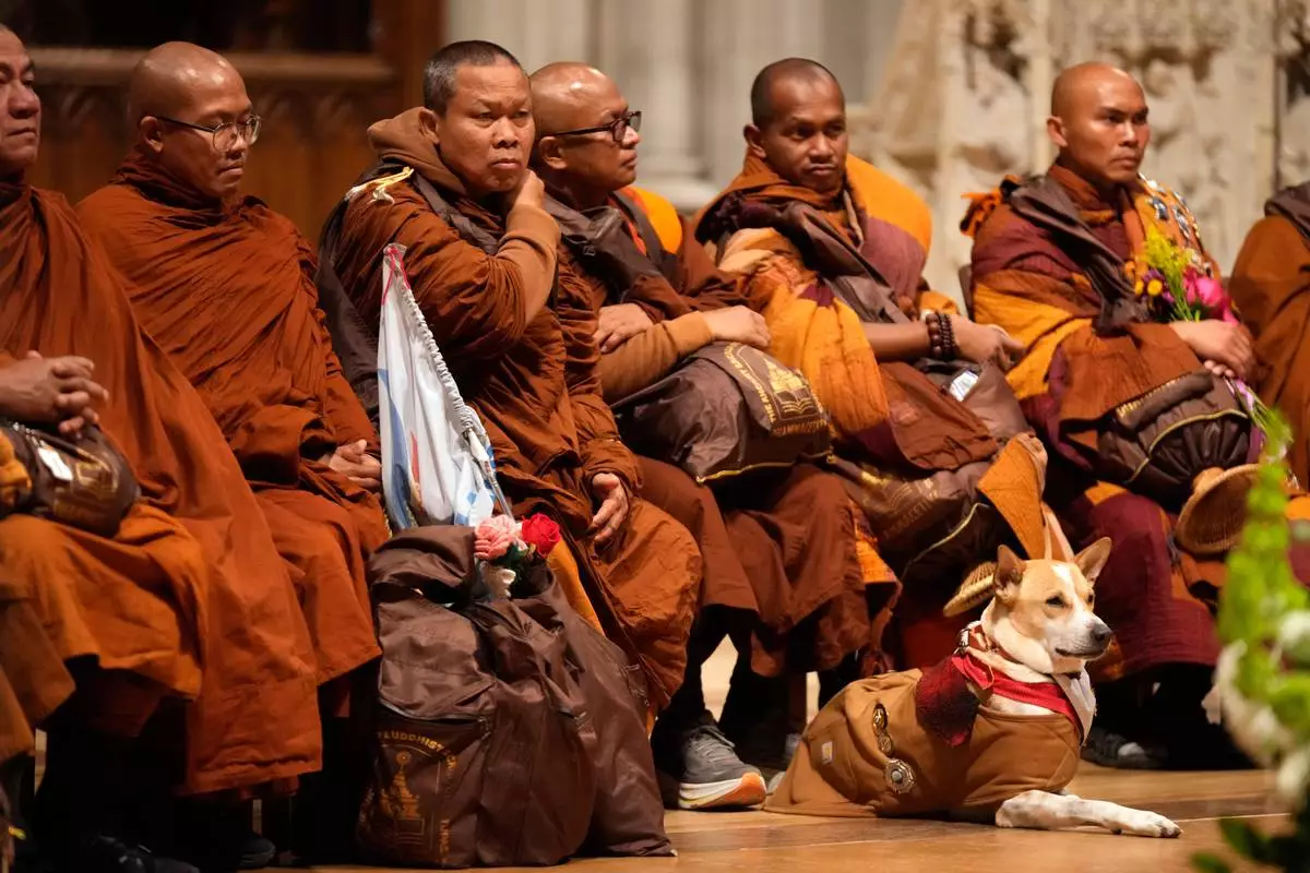 Aloka, a companion dog with Buddhist monks who are participating in a Walk For Peace, sits during an event at the Washington National Cathedral, Tuesday, Feb. 10, 2026, in Washington. (AP Photo/Mark Schiefelbein)