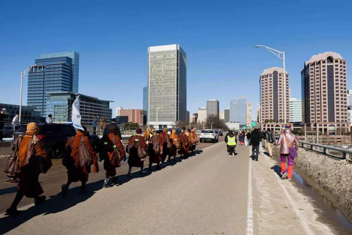 Venerable Buddhist monks cross the 9th Street bridge during a walk for peace into downtown Richmond, Va., Monday, Feb. 2, 2026. (Mike Kropf/Richmond Times-Dispatch via AP)
