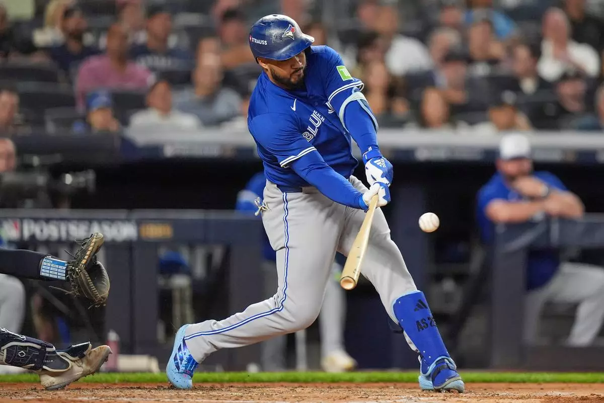 FILE - Toronto Blue Jays' Anthony Santander connects for a two-run RBI single against the New York Yankees during the third inning of Game 3 of baseball's American League Division Series, Oct. 7, 2025, in New York. (AP Photo/Frank Franklin II, File)