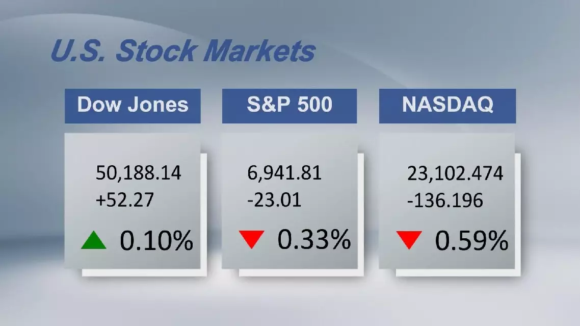 The Dow Jones Industrial Average rose 52.27 points, or 0.10 percent, to 50,188.14. The S and P 500 sank 23.01 points, or 0.33 percent, to 6,941.81. The Nasdaq Composite Index shed 136.196 points, or 0.59 percent, to 23,102.474.