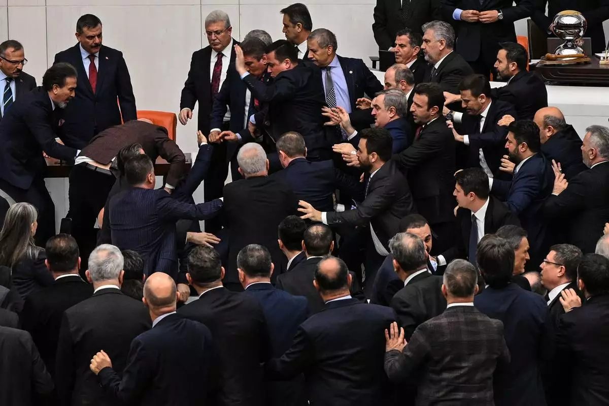 ANKARA, Turkey (AP) — A brawl erupted in Turkey's parliament on Wednesday after lawmakers from the ruling party and the opposition clashed over the appointment of a controversial figure to the Justice Ministry in a Cabinet reshuffle.