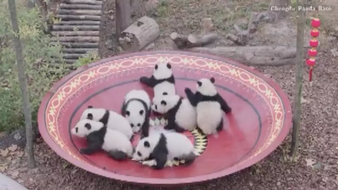 Thirty giant panda cubs were gathered at two breeding bases in southwest China's Sichuan Province on Wednesday to send Spring Festival greetings to all Chinese people through a video link.