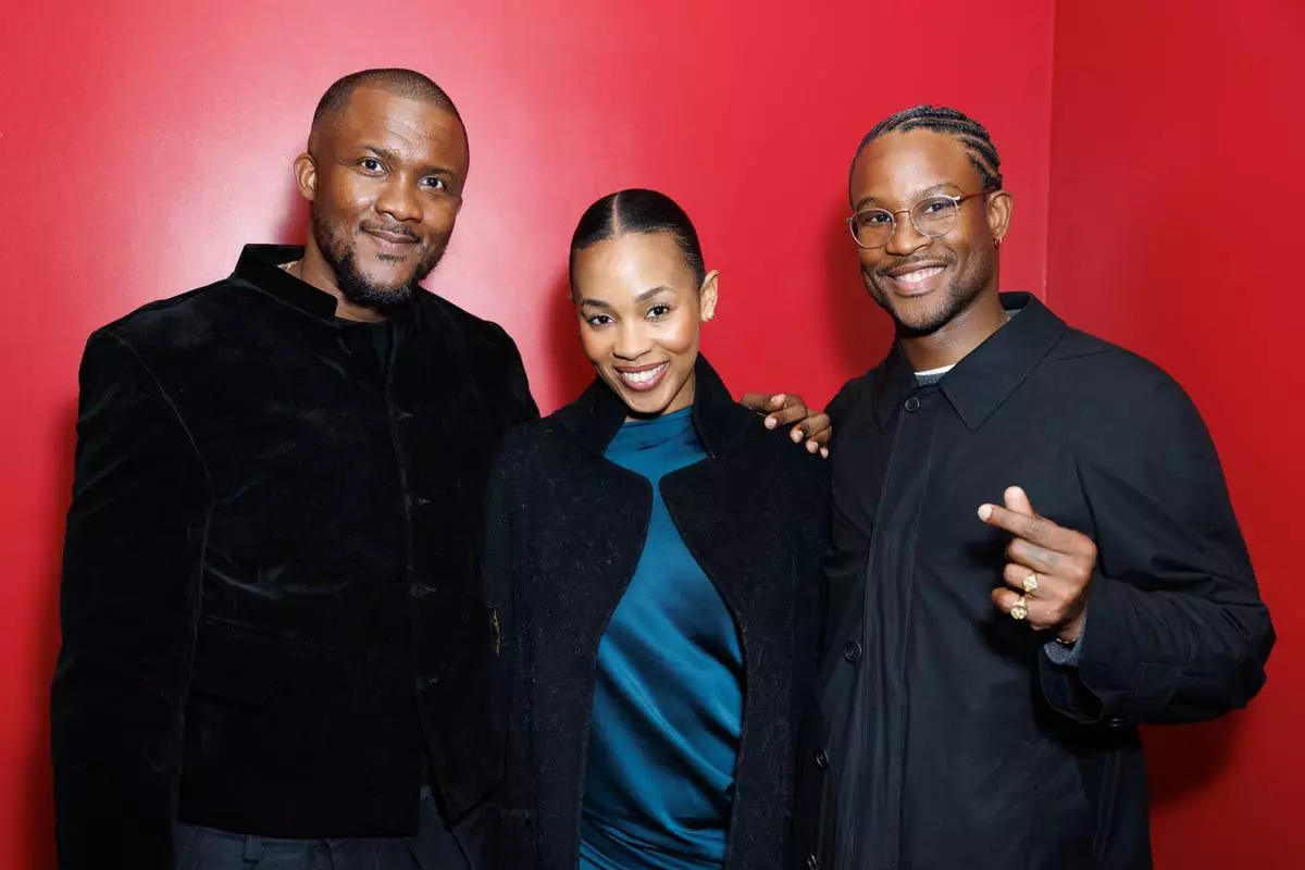 Writer Wale Davies, from left, producer Funmbi Ogunbanwo and director Akinola Davies Jr. pose for photographers upon arrival at the screening of the film "My Father's Shadow" on Friday, Feb. 6, 2026, in London. (Photo by Millie Turner/Invision/AP)