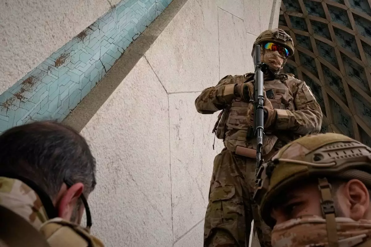 A member of the Revolutionary Guard flashes a victory sign while taking position as a man holds an Iranian flag under the Azadi, or freedom, monument tower during an annual rally marking 1979 Islamic Revolution at the Azadi square in Tehran, Iran, Wednesday, Feb. 11, 2026. (AP Photo/Vahid Salemi)