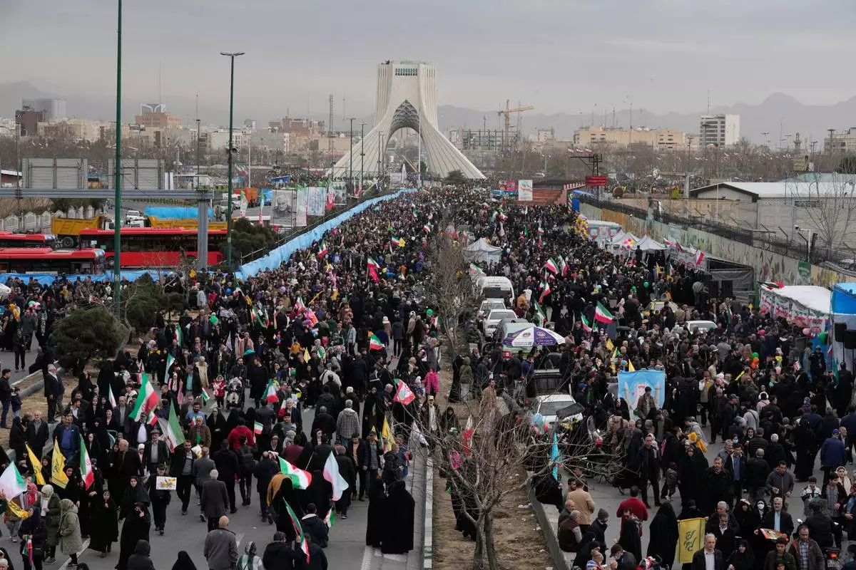 People attend an annual rally marking 1979 Islamic Revolution as the Azadi (Freedom) monument tower is seen at rear in Tehran, Iran, Wednesday, Feb. 11, 2026. (AP Photo/Vahid Salemi)