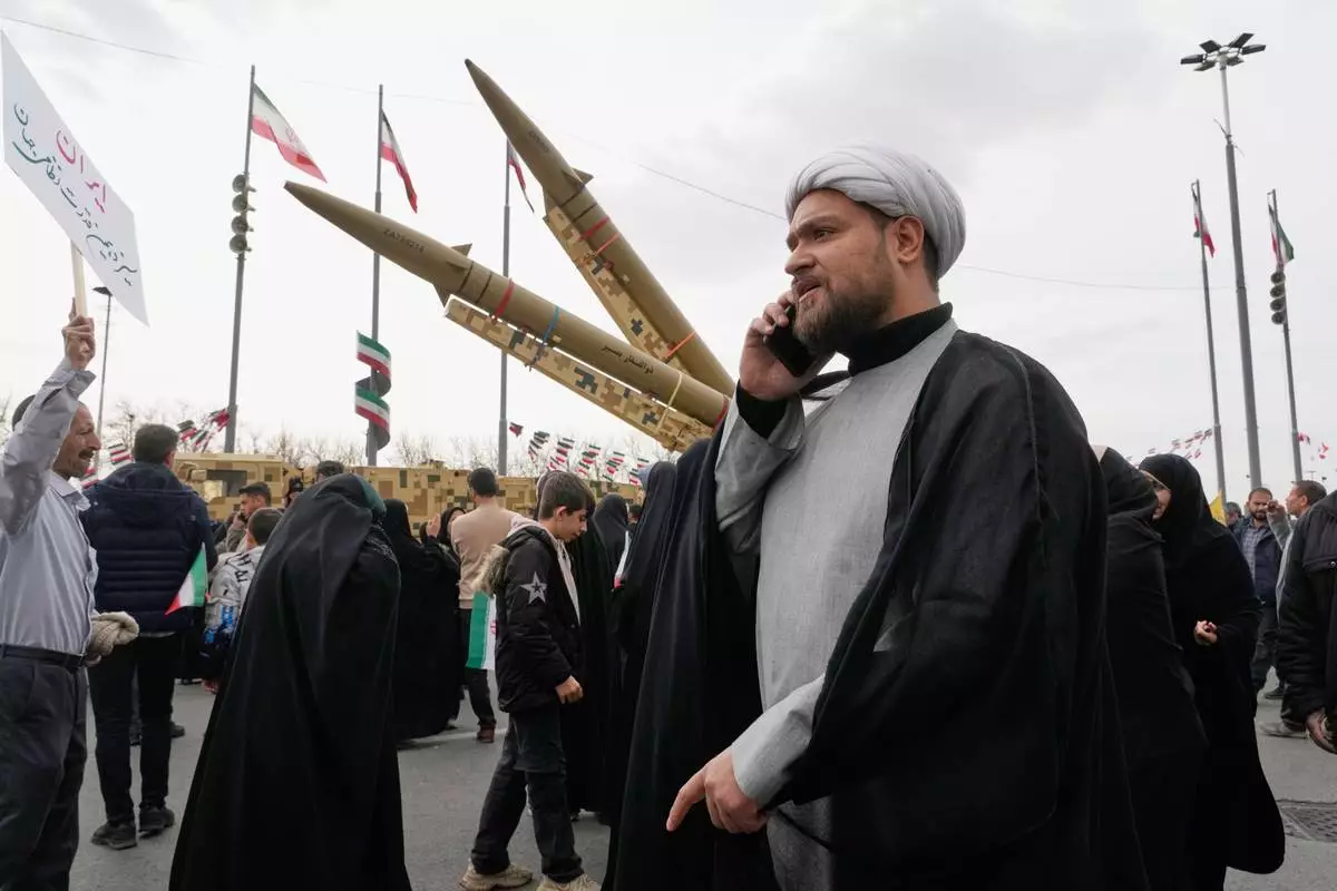 A cleric talks on his phone as he walks in front of domestically-built missiles during an annual rally marking 1979 Islamic Revolution at the Azadi, or Freedom, square in Tehran, Iran, Wednesday, Feb. 11, 2026. (AP Photo/Vahid Salemi)