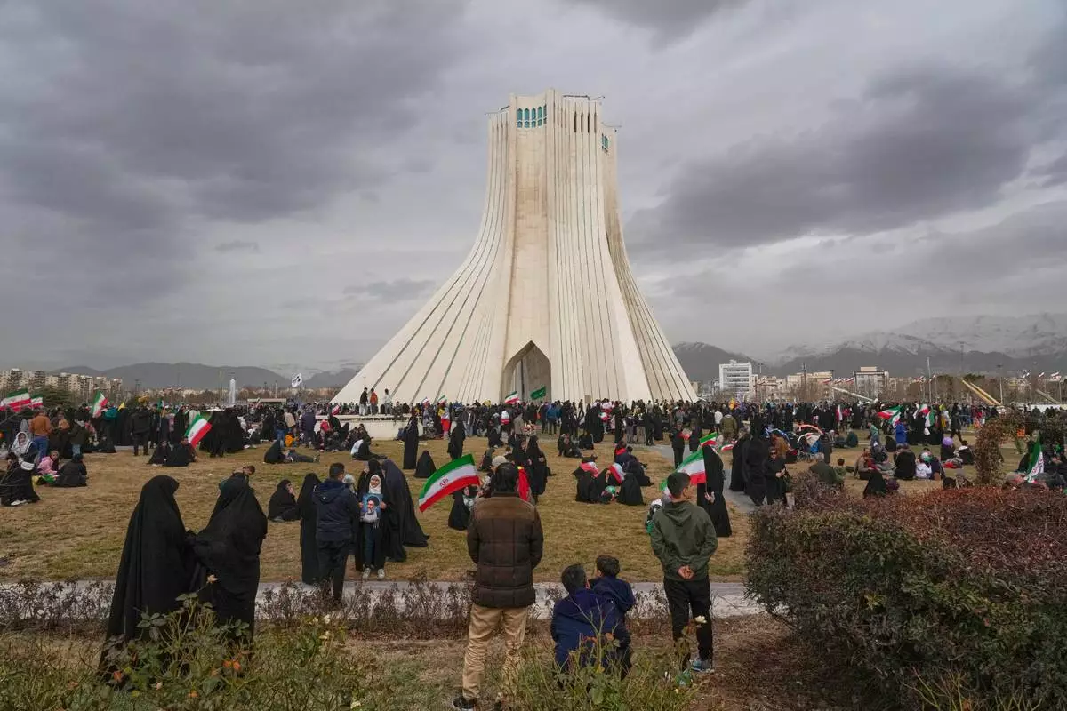 People attend an annual rally marking 1979 Islamic Revolution as they gather around the Azadi (Freedom) monument tower in Tehran, Iran, Wednesday, Feb. 11, 2026. (AP Photo/Vahid Salemi)