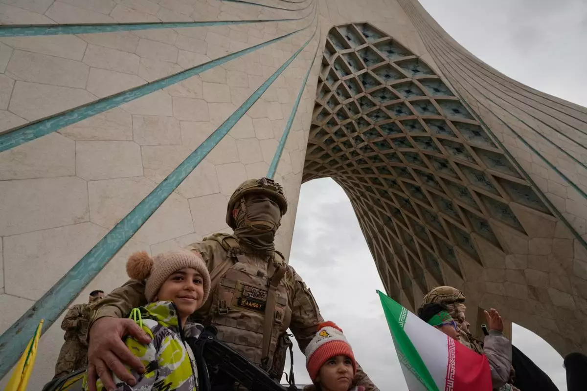 Members of Iran's Revolutionary Guard poses for pictures with children as they stand guard near the Azadi ( Freedom ) monument during the annual rally commemorating the 1979 Islamic Revolution at Azadi Square in Tehran, Iran, Wednesday, Feb. 11, 2026. (AP Photo/Vahid Salemi)