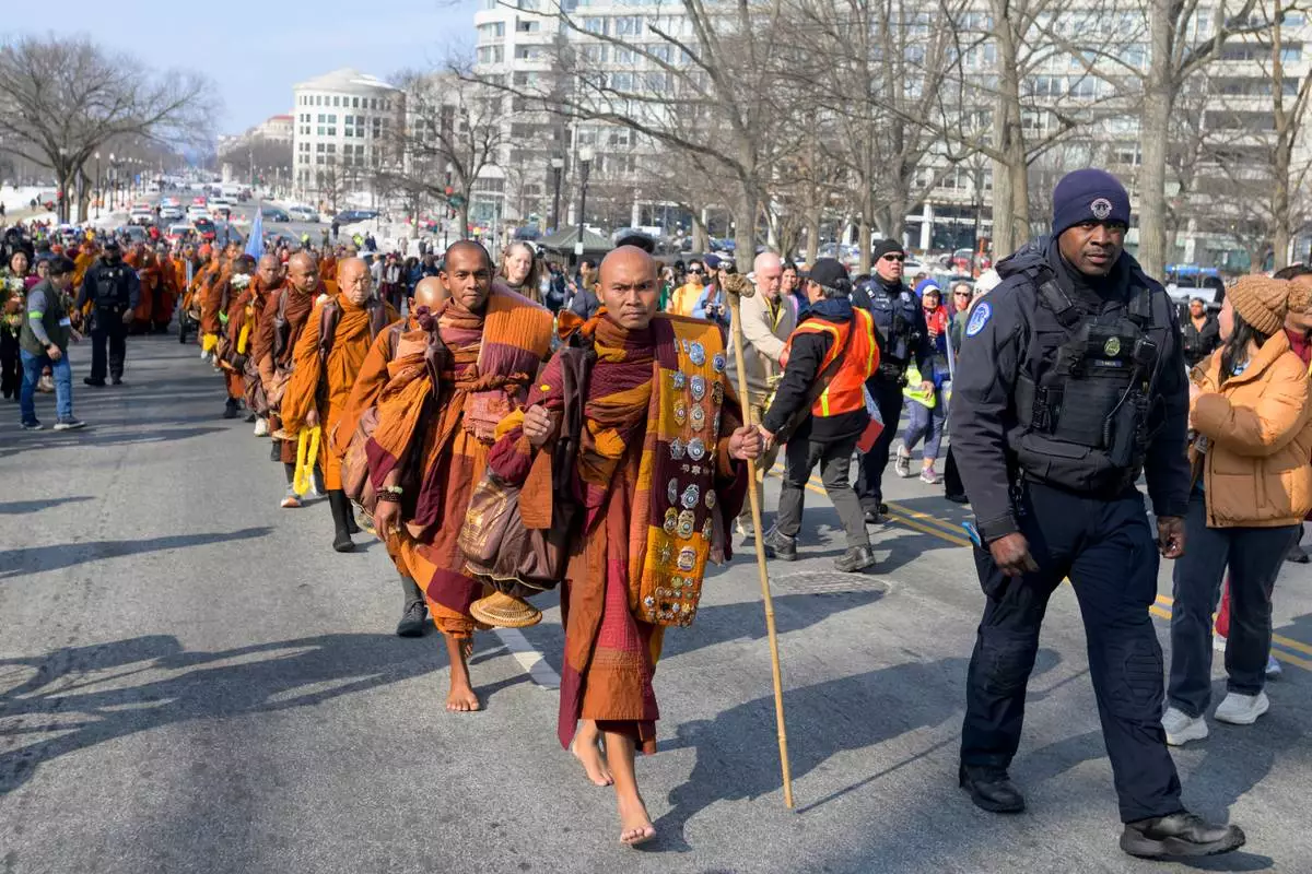 The group left from the Huong Dao Vipassana Bhavana Center, a Buddhist temple in Fort Worth. Long Si Dong, a temple spokesperson, said Wednesday that approaching the U.S. Capitol, he felt “deeply humbled and grateful to witness the large crowd walking quietly behind the monks.”