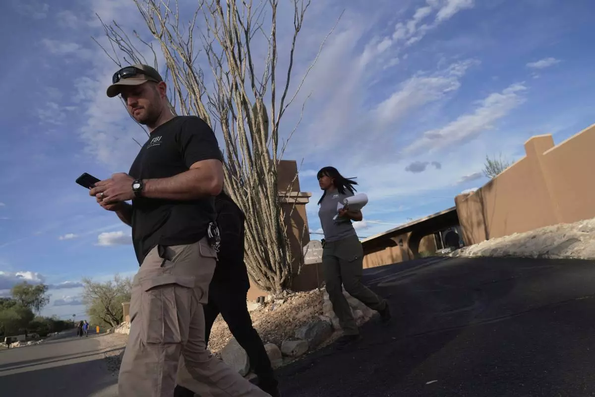 Law enforcement agents walk around the neighborhood where Annie Guthrie, whose mother Nancy Guthrie has been missing for more than a week, lives just outside Tucson, Ariz. (AP Photo/Ty ONeil)