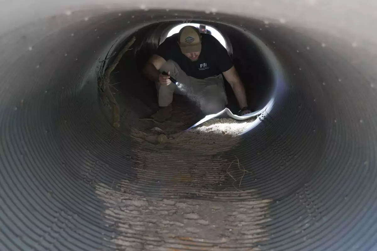 An investigator looks inside a culvert in the neighborhood where Annie Guthrie, whose mother Nancy Guthrie has been missing for more than a week, lives just outside Tucson, Ariz., on Tuesday, Feb. 10, 2026. (AP Photo/Ty ONeil)
