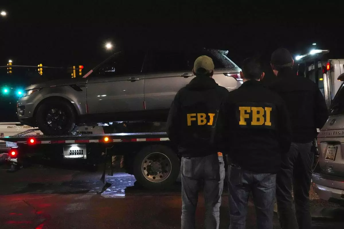 Pima County sheriff and FBI take away a Range Rover from a Culver’s parking lot in Tucson, Ariz. early Saturday, Feb. 14, 2026. (AP Photo/Ty ONeil)