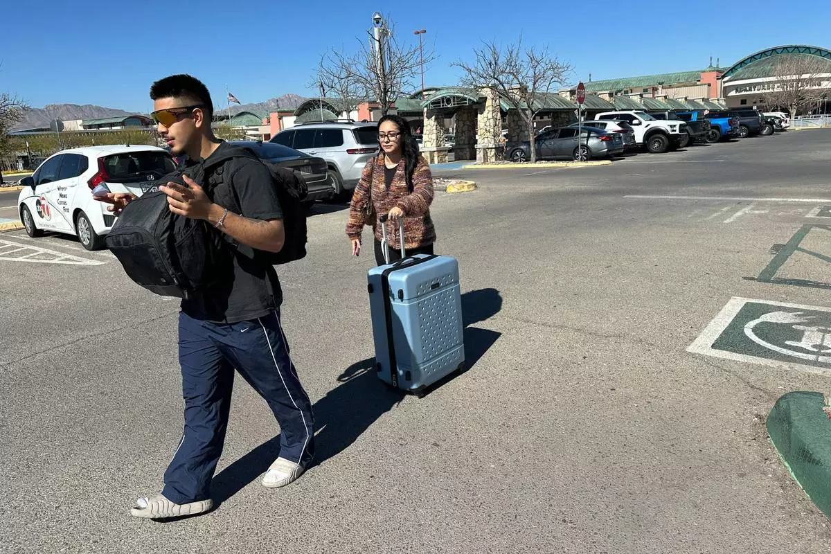 Jorge Rueda, 20, and Yamilexi Meza, 21, who arrived from Las Cruces, N.M., walk through a parking lot at El Paso International Airport in El Paso, Texas, on Wednesday, Feb. 11, 2026. (AP Photo/Morgan Lee)