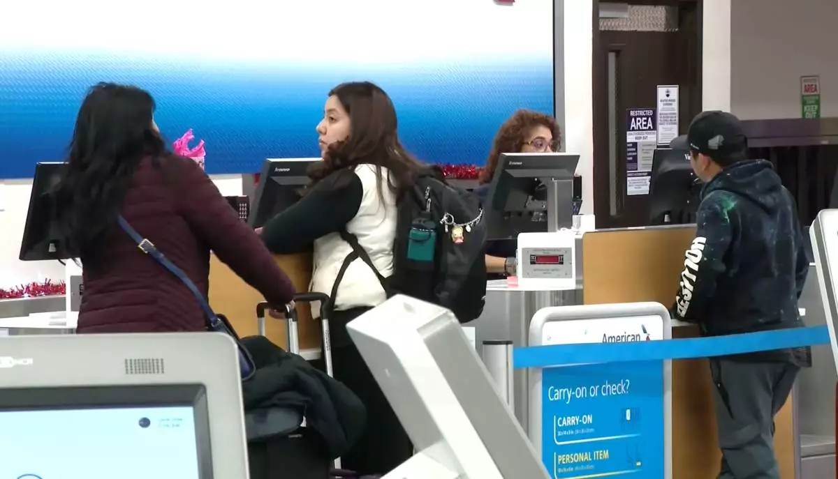 Passengers wait in line at the El Paso International Airport after all flights were grounded on Wednesday, Feb. 11, 2026. (KFOX via AP)