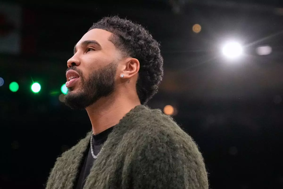 Boston Celtics forward Jayson Tatum stands next to the bench during a time out in the first half of an NBA basketball game against the Chicago Bulls, Wednesday, Feb. 11, 2026, in Boston. (AP Photo/Charles Krupa)