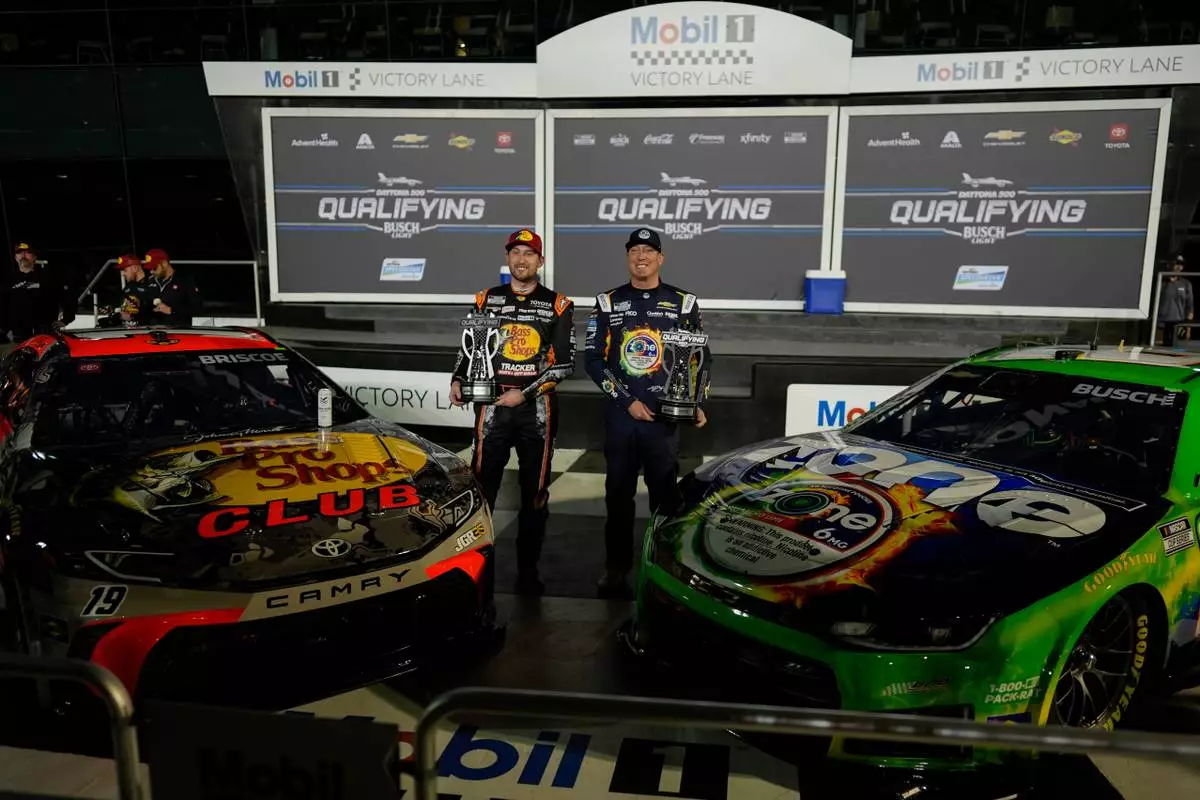 Chase Briscoe and Kyle Busch, from left, pose for a photo after NASCAR Daytona 500 qualifying, Wednesday, Feb. 11, 2026, in Daytona, Fla. (AP Photo/Mike Stewart)