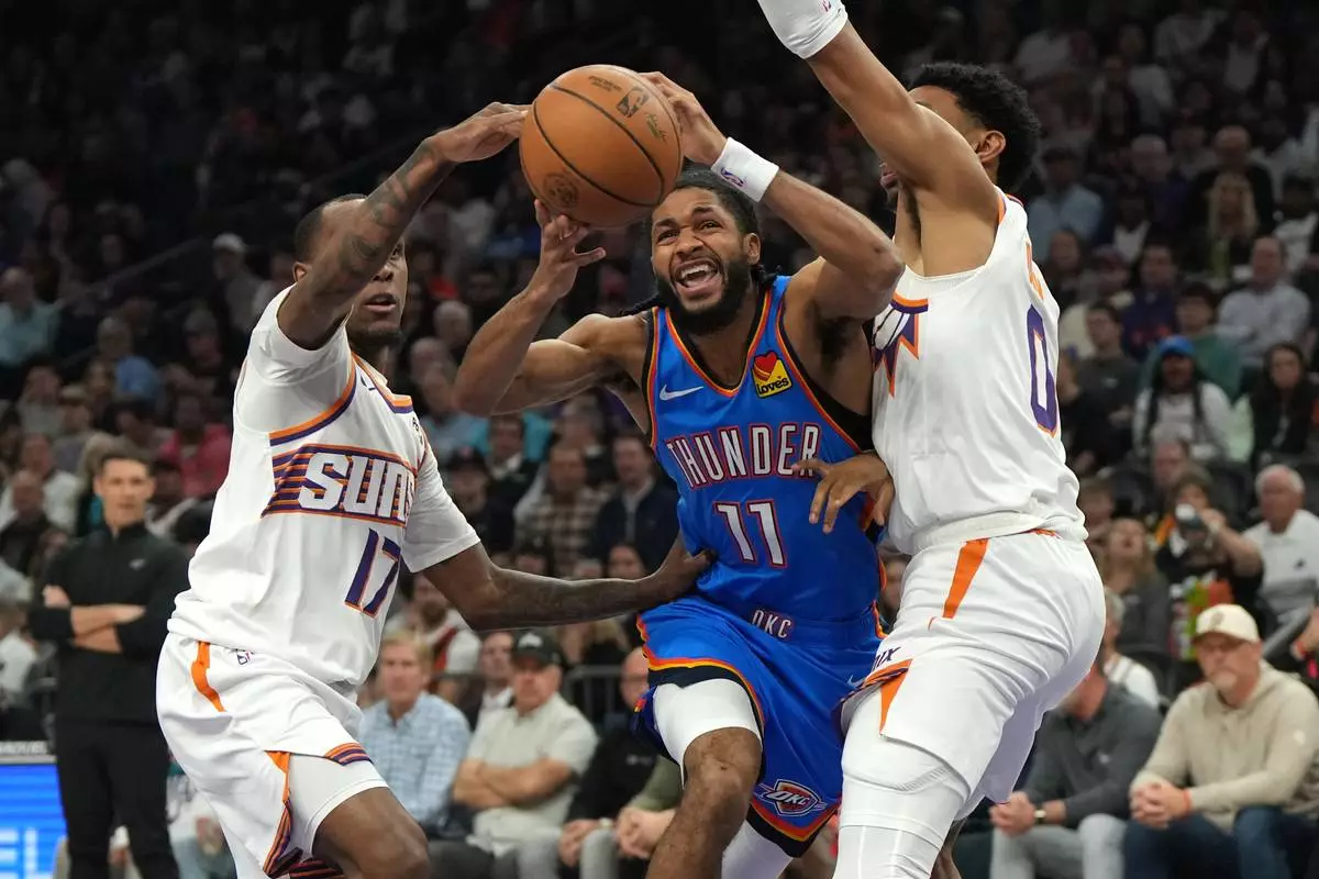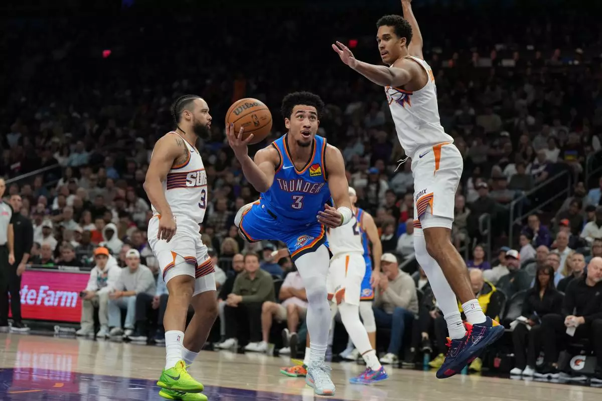 Oklahoma City Thunder guard Isaiah Joe drives between Phoenix Suns guard Amir Coffey (17) and forward Ryan Dunn during the first half of an NBA basketball game, Wednesday, Feb. 11, 2026, in Phoenix. (AP Photo/Rick Scuteri)