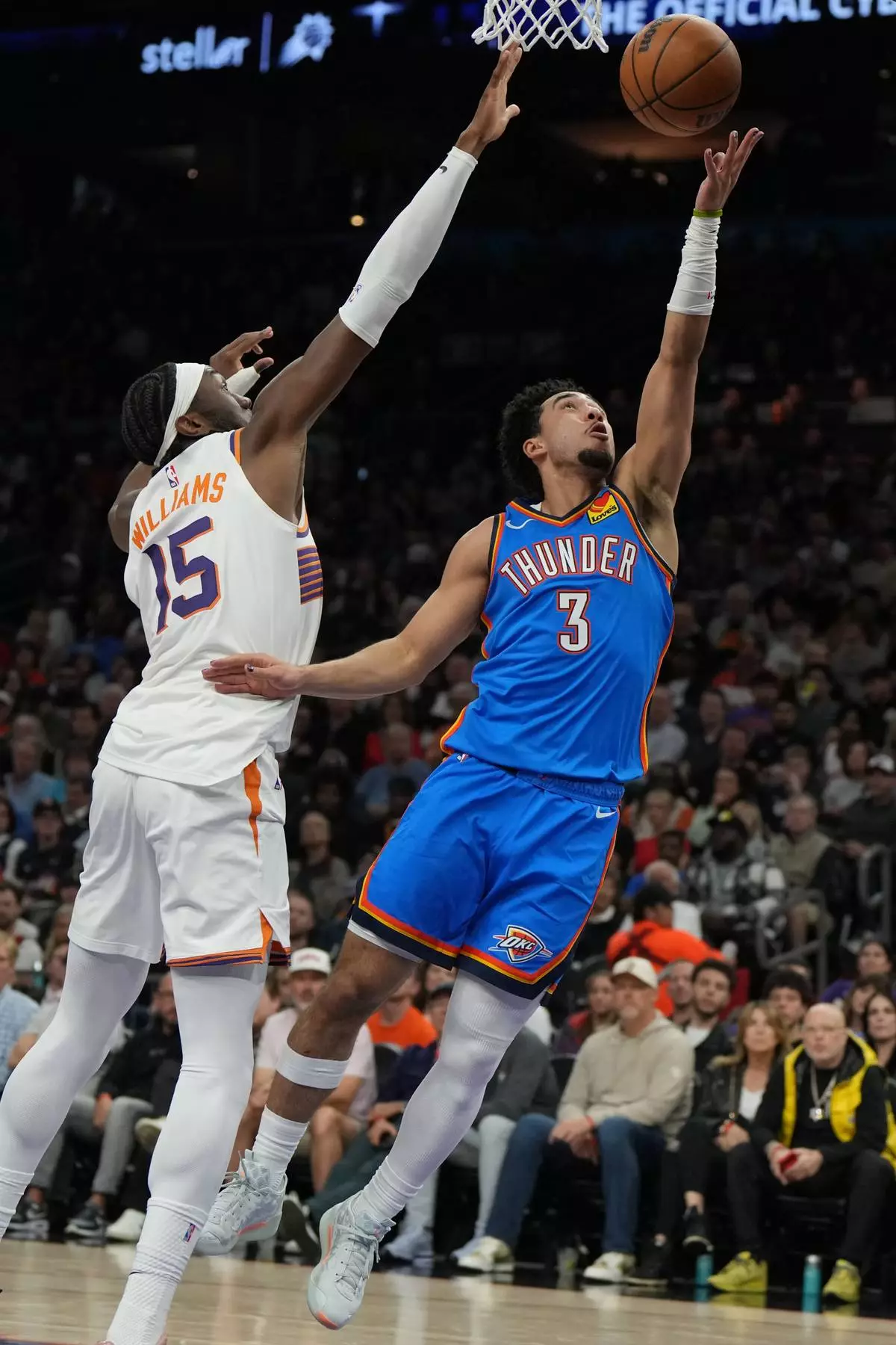 Oklahoma City Thunder guard Jared McCain (3) drives past Phoenix Suns center Mark Williams during the first half of an NBA basketball game, Wednesday, Feb. 11, 2026, in Phoenix. (AP Photo/Rick Scuteri)