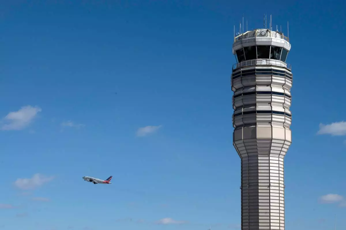 An airplane takes off behind the control tower at Ronald Reagan Washington National Airport, on the anniversary of the Potomac River mid-air collision between an American Airlines passenger plane and an Army Blackhawk helicopter, Thursday, Jan. 29, 2026, in Arlington, Va. (AP Photo/Cliff Owen)