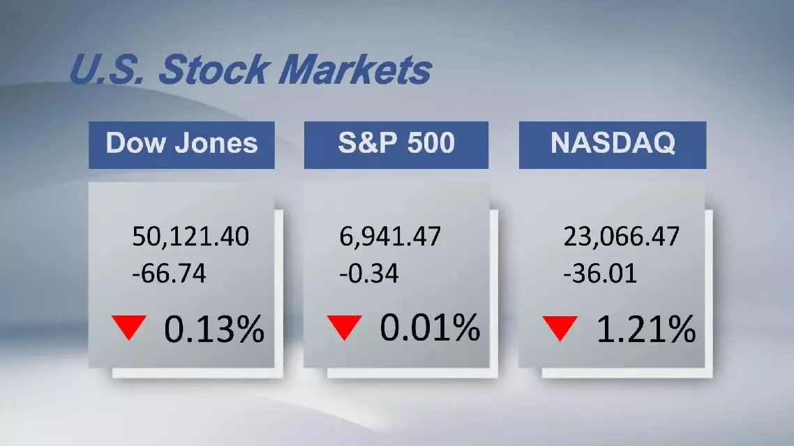 The Dow Jones Industrial Average fell by 66.74 points, or 0.13 percent, to 50,121.4. The S&P 500 sank 0.34 points to 6,941.47. The Nasdaq Composite Index shed 36.007 points, or 0.16 percent, to 23,066.467.