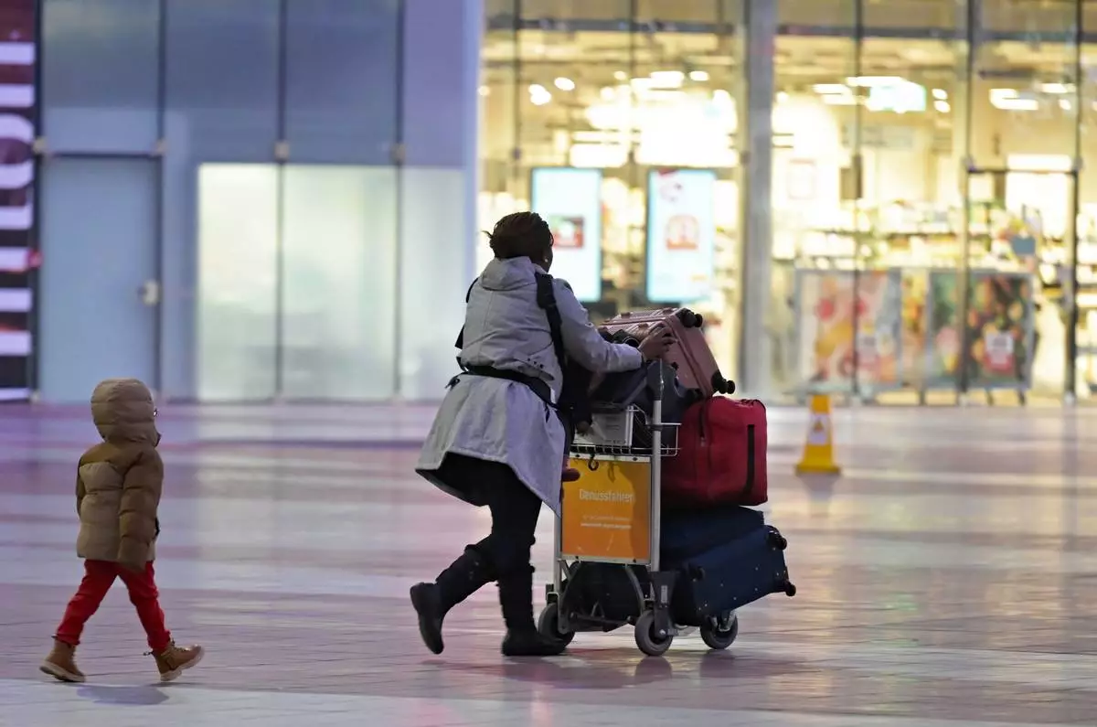 A woman and a child walk through the central area of Munich Airport, Bavaria, Thursday, Feb.12, 2026, as Lufthansa pilots and flight attendants go on a full-day strike. (Malin Wunderlich/dpa via AP)