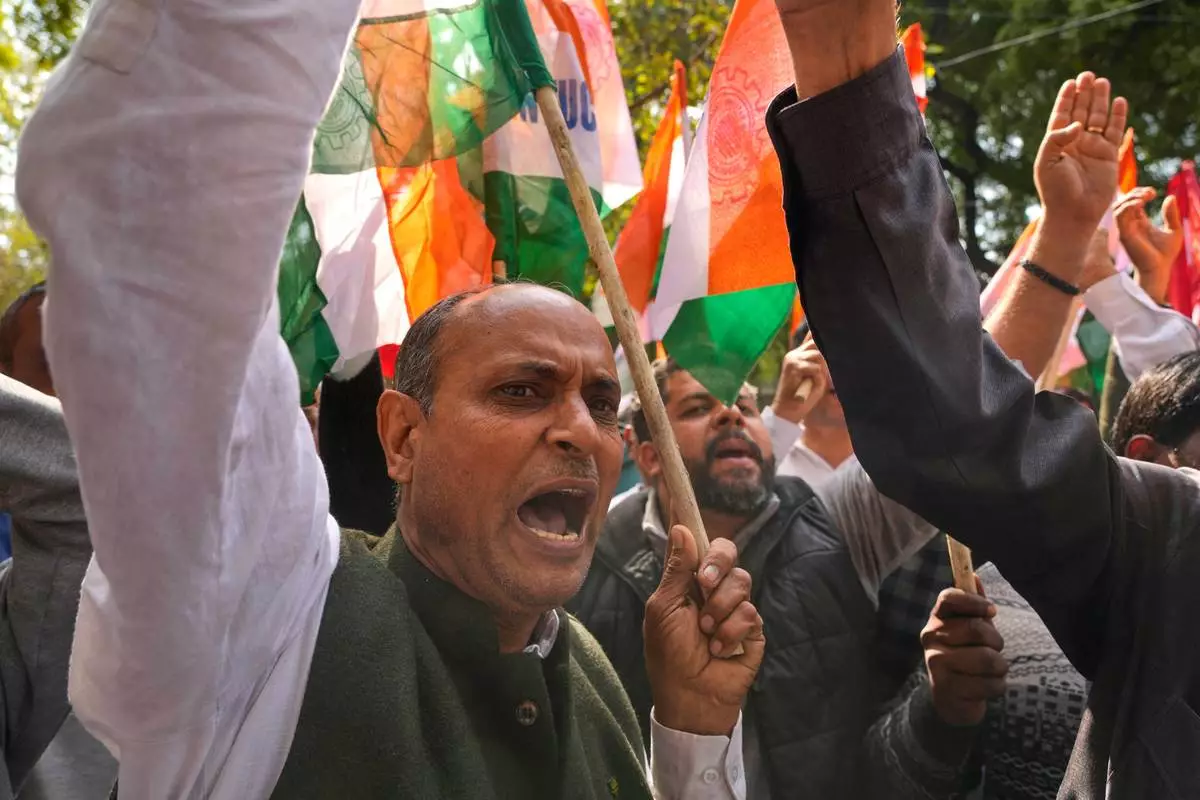 Members of the opposition stage a protest against the India-US trade deal outside the Parliament in New Delhi, India, Thursday, Feb. 12, 2026. (AP Photo)