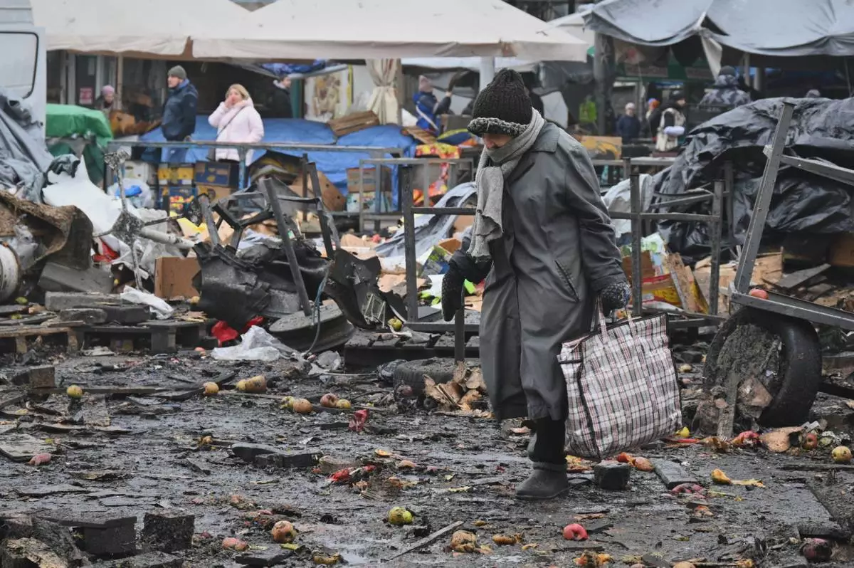 People walk at a ruined city market following a Russia's attack in Odesa, Ukraine, Thursday, Feb. 12, 2026. (AP Photo/Michael Shtekel)