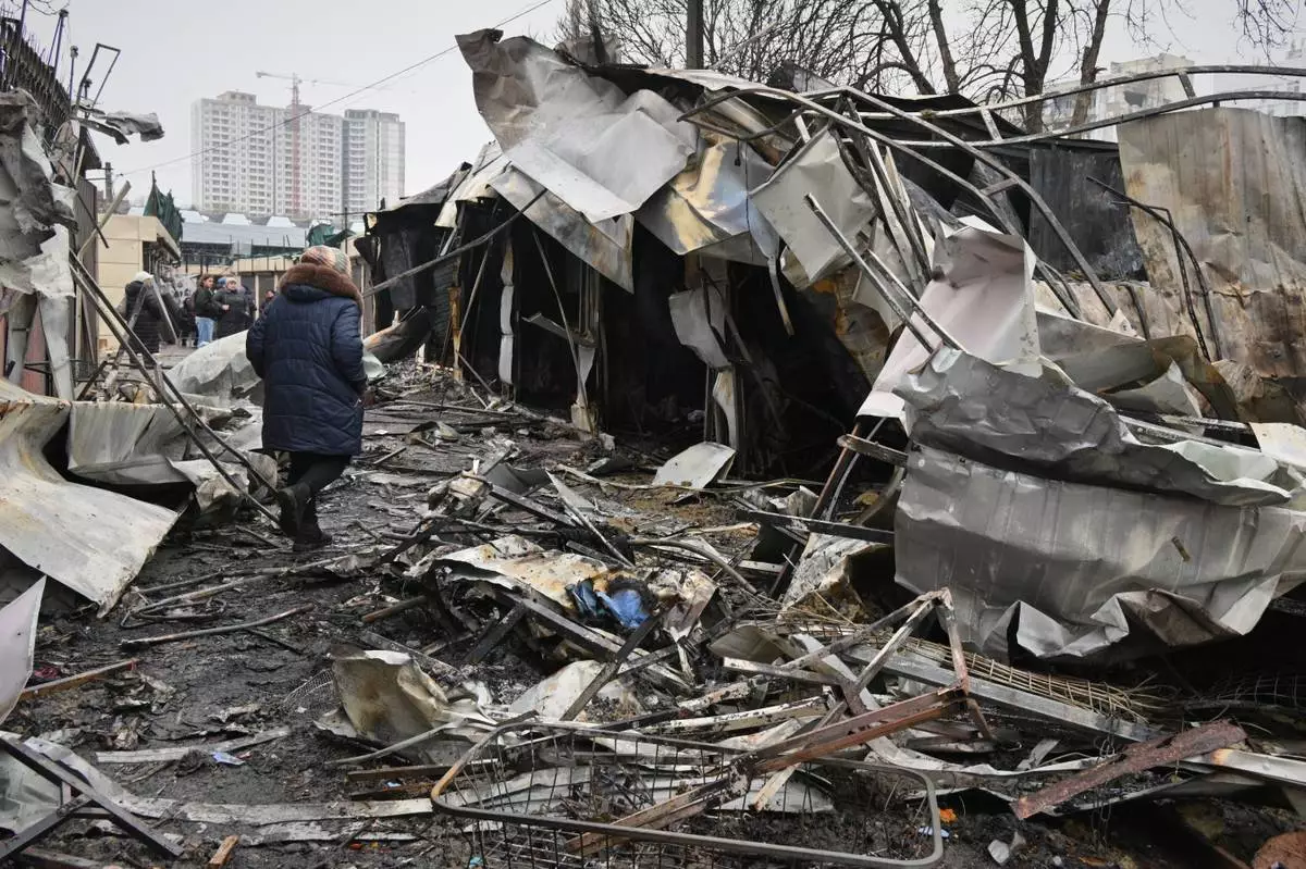 People look at a ruined city market following a Russia's attack in Odesa, Ukraine, Thursday, Feb. 12, 2026. (AP Photo/Michael Shtekel)