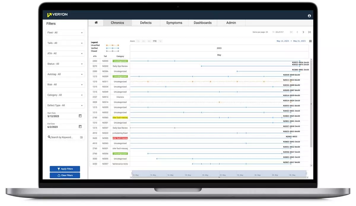 Automatically identify, cluster, and analyze repeat aircraft defects with Veryon Defect Analysis.