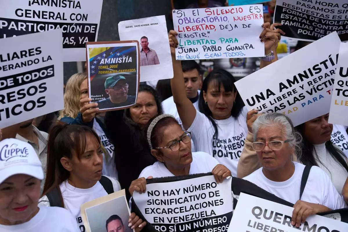 People who consider their detained family members to be political prisoners protest for their releases outside the National Assembly in Caracas, Venezuela, Tuesday, Feb. 10, 2026. (AP Photo/Ariana Cubillos)