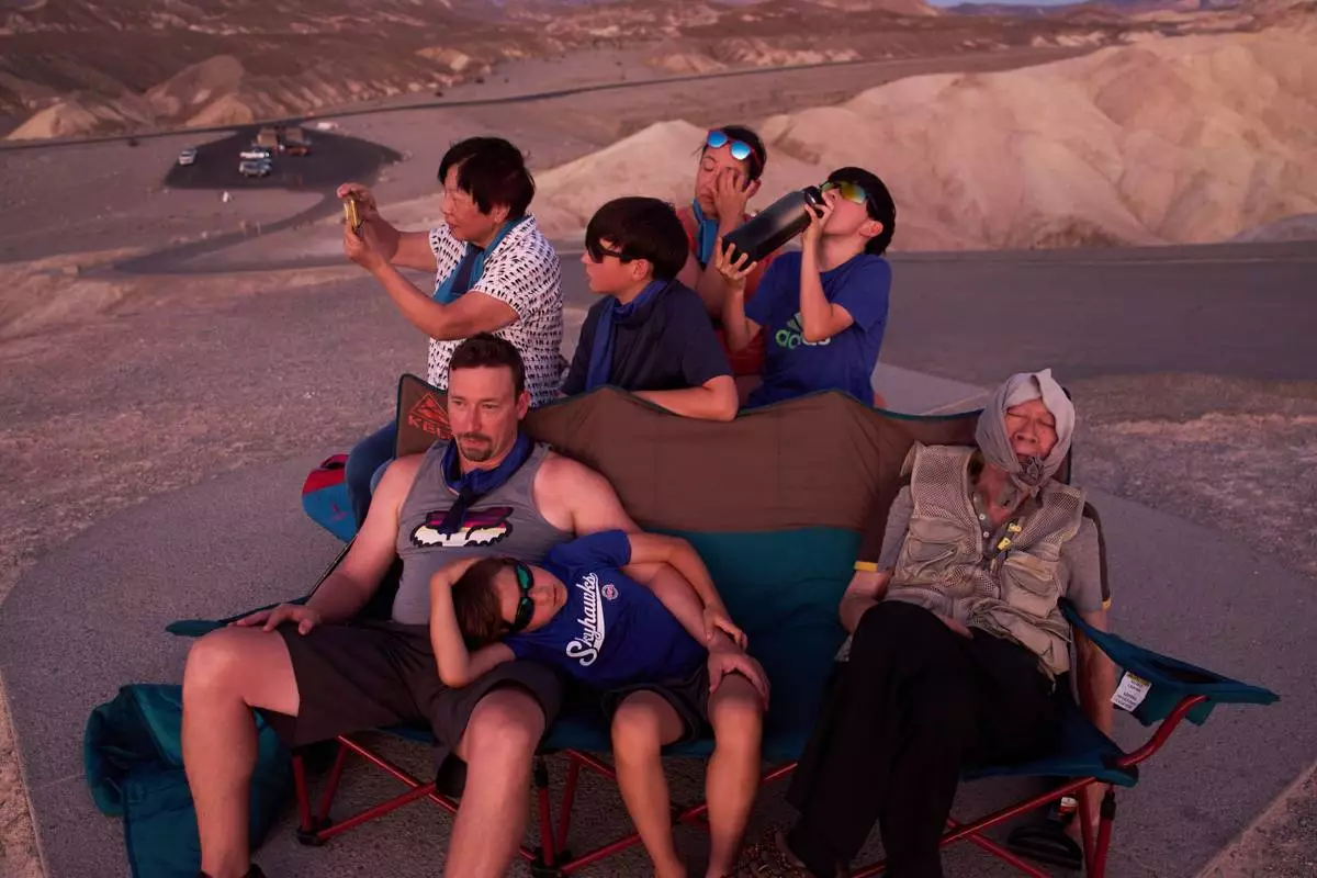 FILE Joe Chyuwei, right, Addison Black, front center, James Black, front left, and back row from left, Helen Chyuwei, Jameson Black, Grace Chyuwei and Grayson Black watch the sunset in the heat at Zabriskie Point, Aug. 3, 2025, in Death Valley National Park, Calif. (AP Photo/John Locher, File)