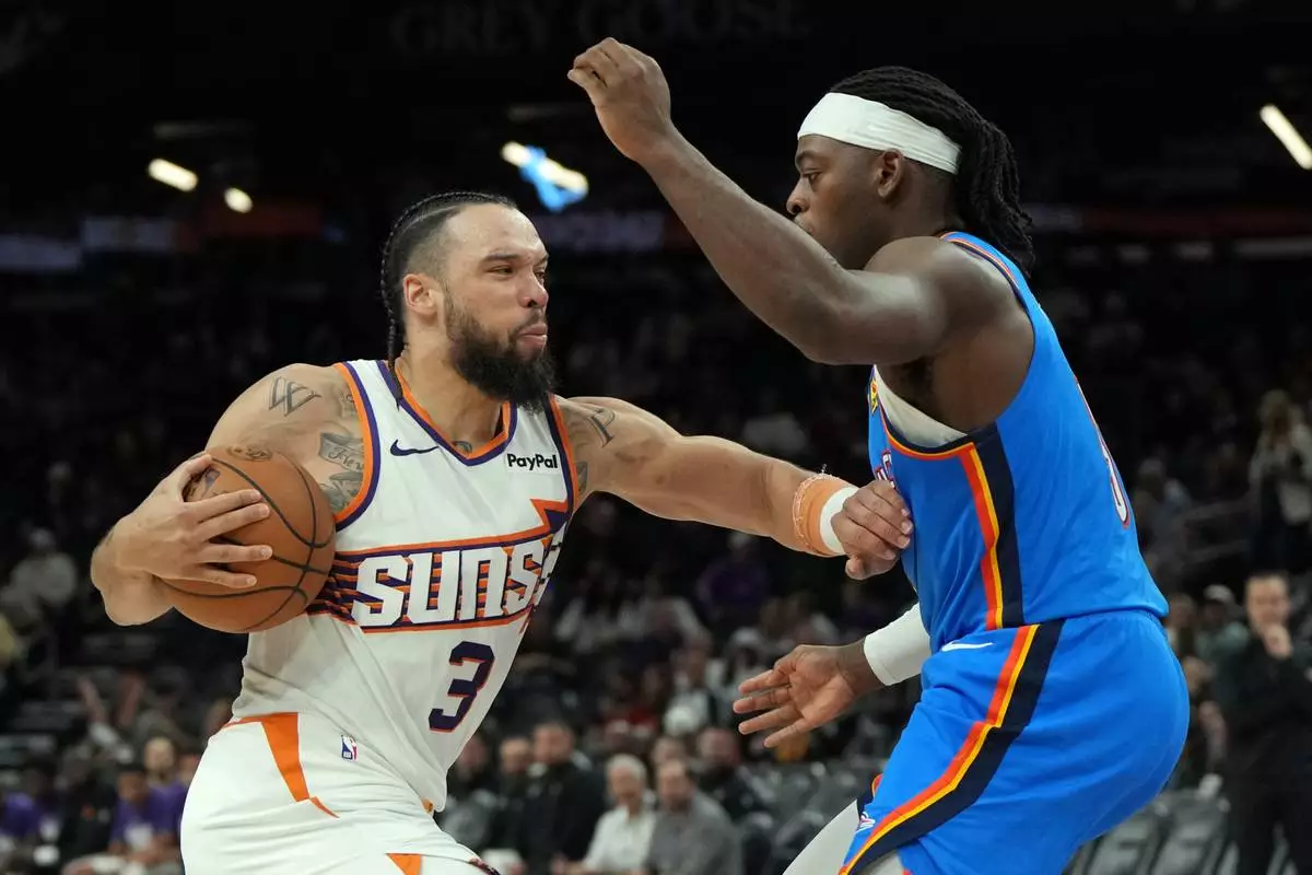 Phoenix Suns forward Dillon Brooks (3) drives on Oklahoma City Thunder guard Luguentz Dort during the second half of an NBA basketball game, Wednesday, Feb. 11, 2026, in Phoenix. (AP Photo/Rick Scuteri)