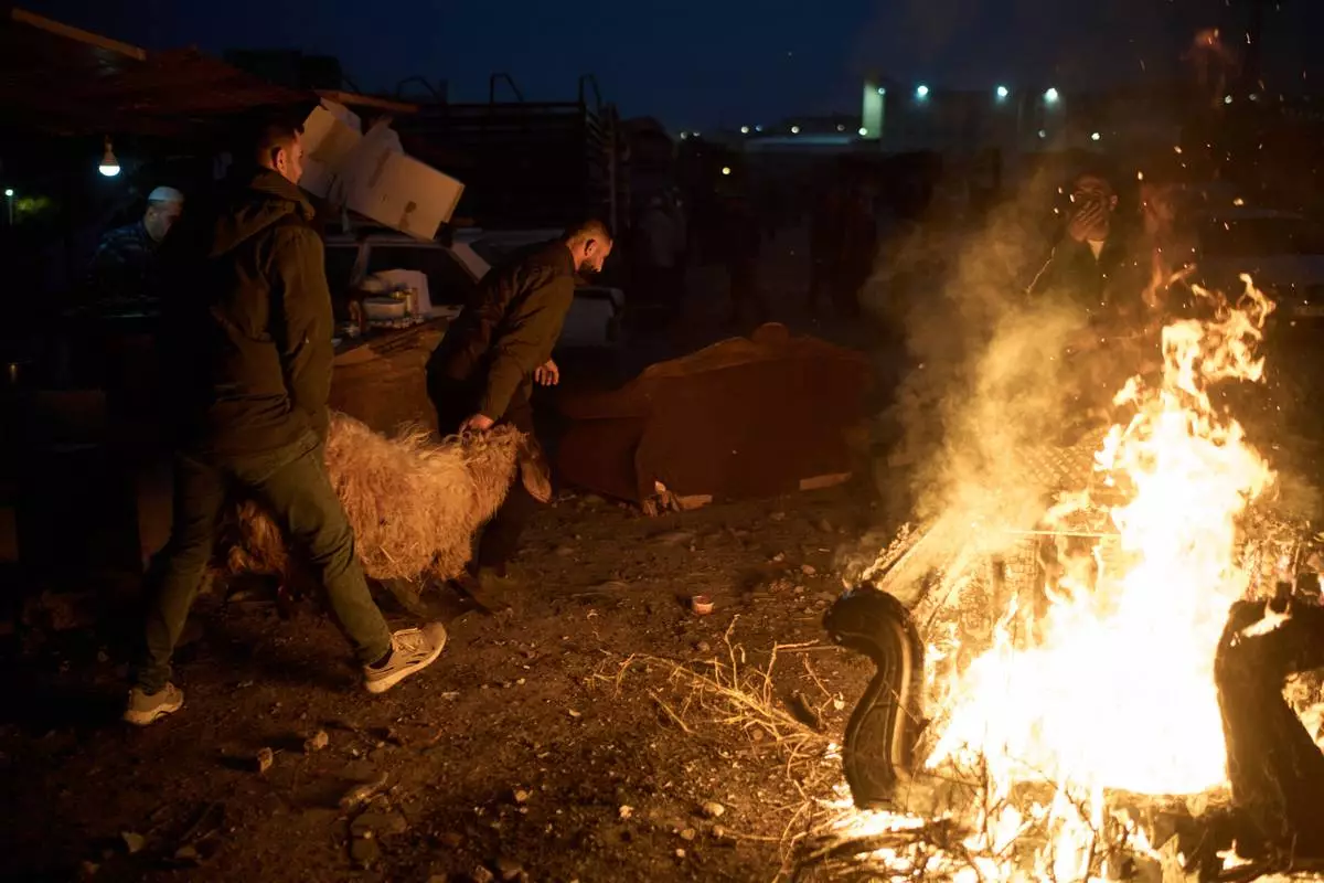 Palestinians carry a sheep past a bonfire at a livestock market near Balata refugee camp on the outskirts of the West Bank city of Nablus, Thursday, Feb. 12, 2026. (AP Photo/Leo Correa)
