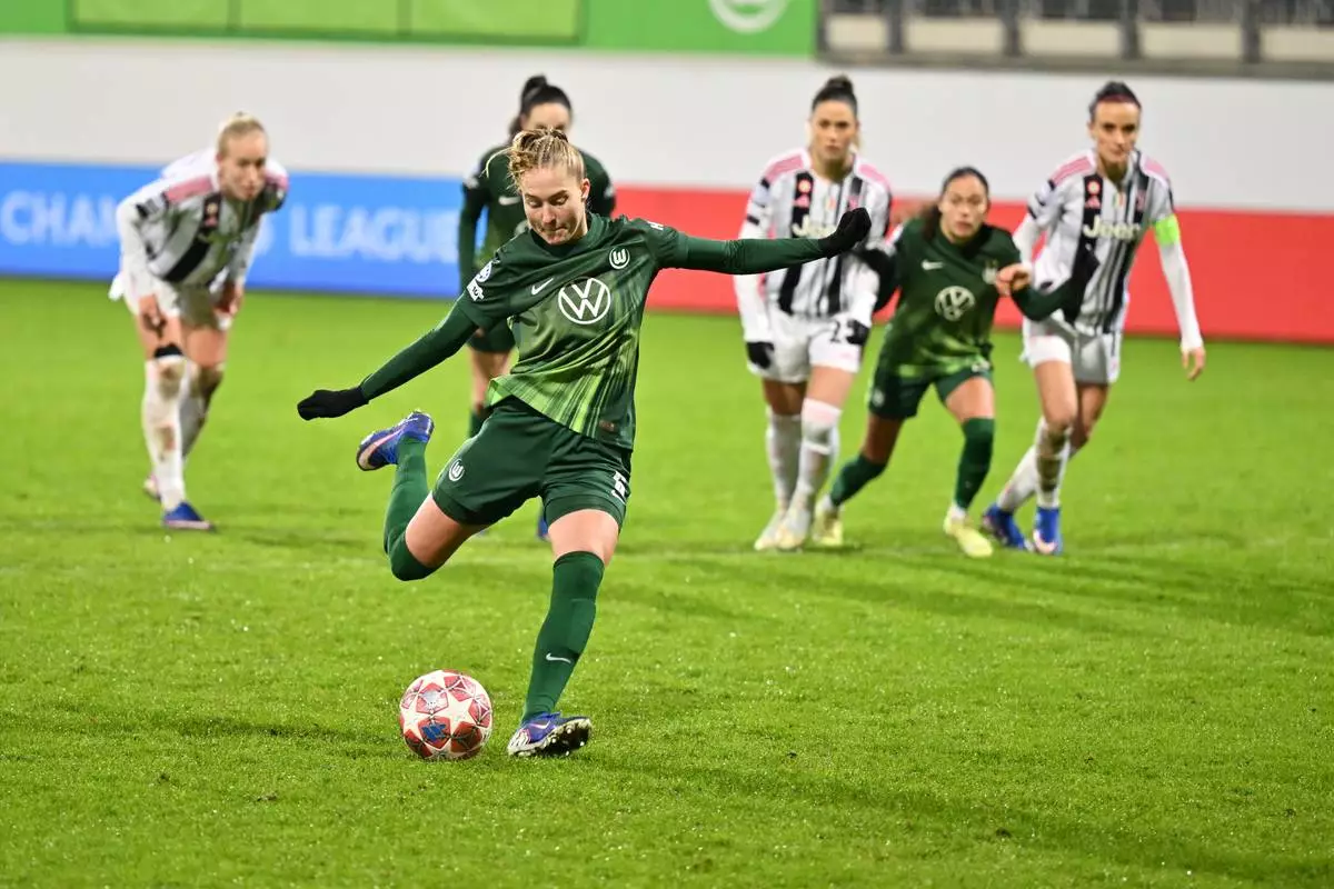 Wolfsburg's Janina Minge takes a penalty during a women's Champions League soccer match between VfL Wolfsburg and Juventus FC, Thursday, Feb. 12, 2026, in Wolfsburg, Germany. (Swen Pförtner/dpa via AP)